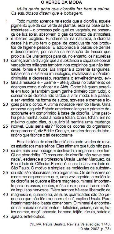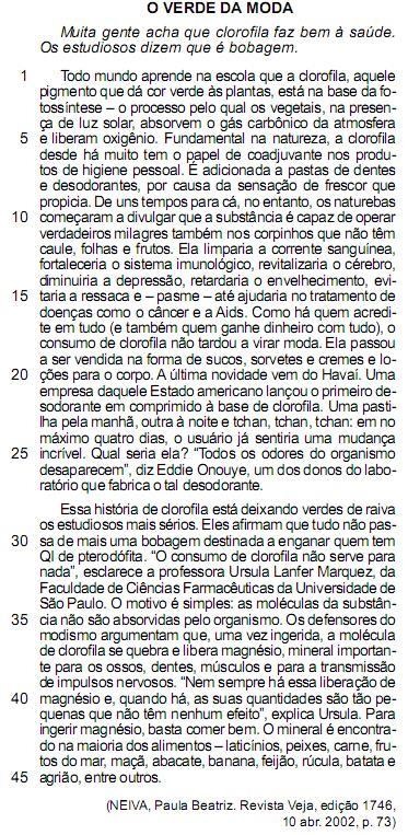 “Ela limparia a corrente sanguínea, fortaleceria o sistema imunológico, revitalizaria o cérebro, diminuiria a depressão, retardaria o envelhecimento, evitaria a ressaca e – pasme – até ajudaria no tratamento de doenças como o câncer e a Aids” (1º §, l. 12-16). Nesta passagem, o autor indica a incerteza frente ao que está sendo expresso. Assinale a alternativa que apresenta o elemento linguístico utilizado para concretizar esse posicionamento: