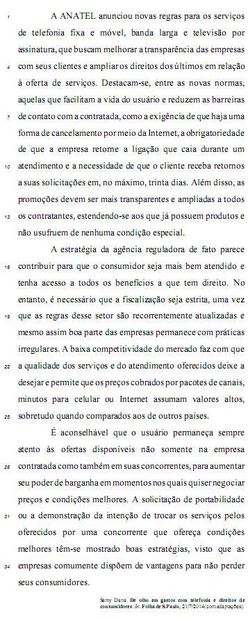 “como a exigência (...) trinta dias” (l. 7 a 11): a exemplo da exigência de que exista uma forma de cancelamento por meio da Internet, uma obrigatoriedade da empresa retornar a ligação se ela cair durante um atendimento e o cliente deve retornar suas solicitações em um prazo máximo de trinta dias.
