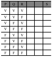 A partir das proposições simples P: “Sandra foi passear no centro comercial Bom Preço”, Q: “As lojas do centro comercial Bom Preço estavam realizando liquidação” e R: “Sandra comprou roupas nas lojas do Bom Preço” é possível formar a proposição composta S: “Se Sandra foi passear no centro comercial Bom Preço e se as lojas desse centro estavam realizando liquidação, então Sandra comprou roupas nas lojas do Bom Preço ou Sandra foi passear no centro comercial Bom Preço”. Considerando todas as possibilidades de as proposições P, Q e R serem verdadeiras (V) ou falsas (F), é possível construir a tabela-verdade da proposição S, que está iniciada na tabela mostrada a seguir.