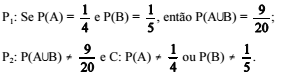 A partir das probabilidades P(A), P(B) e P(A∪B) — que são, respectivamente, as probabilidades de os eventos A, B e A∪B ocorrerem —, considere o argumento formado pelas premissas P1 e P2 e pela conclusão C, em que