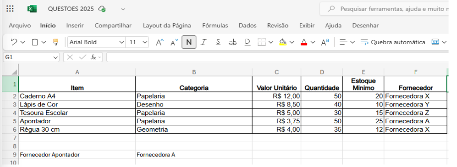 O operador deseja saber qual é o fornecedor do item "Apontador" de maneira automática. Para isso, montou uma combinação de funções na célula B9 que permitiu localizar o nome do fornecedor com base no nome do item.