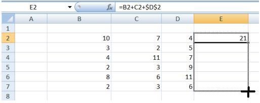 A Figura apresentada a seguir mostra parte de uma planilha do aplicativo Excel do Microsoft Office 2007. Na célula E2 desse aplicativo foi digitado =B2+C2+$D$2. A célula E2 foi selecionada e seu conteúdo arrastado para as demais linhas da coluna E, conforme ilustrado na Figura.