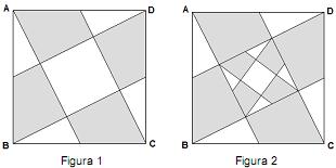 Um quadrado ABCD foi dividido em várias regiões, em um processo feito em dez etapas. Na primeira, o vértice A foi ligado ao ponto médio do lado BC, o vértice B foi ligado ao ponto médio do lado CD, e assim sucessivamente, como mostra a Figura 1. Na segunda etapa, o quadrado central obtido na primeira foi dividido segundo a mesma lógica, como ilustra a Figura 2.