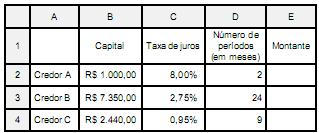 A linha 2 mostra uma dívida de R$ 1.000,00 (célula B2) com um Credor A (célula A2) que deve ser paga em 2 meses (célula D2) com uma taxa de juros de 8% ao mês (célula C2) pelo regime de juros simples. A fórmula correta que deve ser digitada na célula E2 para calcular o montante que será pago é