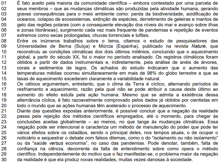 V. O uso das expressões “É fato aceito” (linha 01) e “é fato razoavelmente comprovado” (linha 19) expressa, em ambos os casos, dubiedade e hesitação em relação ao argumento apresentado.