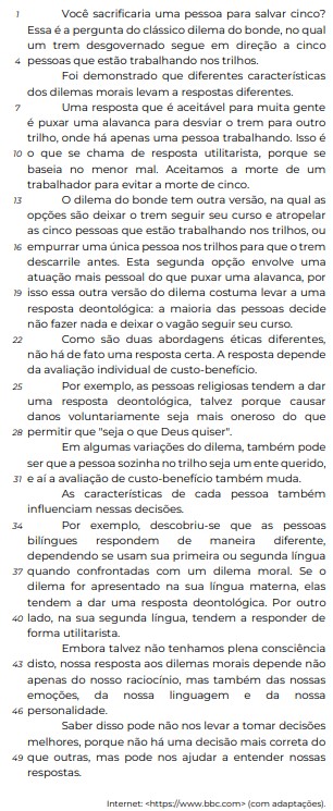 Quando se trata da versão do dilema do bonde apresentada no quarto parágrafo, a primeira opção de resposta citada é preferida à segunda pela maioria das pessoas.