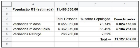 Considere a planilha a seguir, produzida no Google Planilhas, que contém dados sobre a vacinação de Covid-19 no RS, em determinada data.