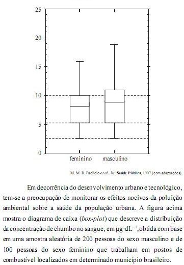 Com base nas linhas horizontais que cortam as caixas do diagrama apresentado, conclui-se corretamente que a média das concentrações de chumbo encontradas no sangue das pessoas do sexo feminino que trabalham em postos de combustível do referido município brasileiro é inferior à média das concentrações dessa mesma substância no sangue das pessoas do sexo masculino que trabalham nesses postos de combustível.