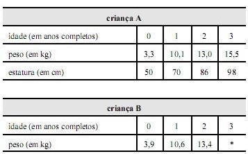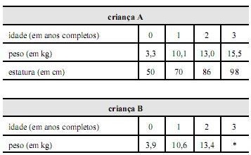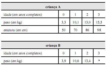 Sabendo-se que o índice de massa corporal de um indivíduo corresponde ao quociente entre o peso, em quilogramas, e o quadrado da altura, em metros, é correto afirmar que, se o índice de massa corporal da criança B ao nascer era de 15,6 kg/m2 , então, ela nasceu com mais de 52 cm de altura.