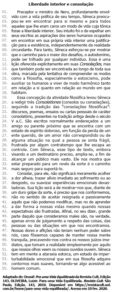 I - O pronome possessivo seu (l. 02) faz referência a um termo subsequente, Sêneca (l. 02).