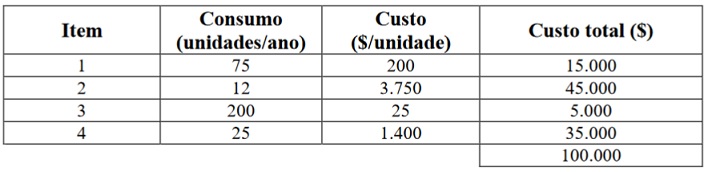 Para gerenciamento dos estoques, é possível utilizar o método de classificação de materiais chamado de Análise ABC. No quadro a seguir, é apresentado o histórico de consumo de materiais do almoxarifado de uma determinada instituição de ensino, contendo as quantidades em valor absoluto, o custo unitário e custo total de cada item.