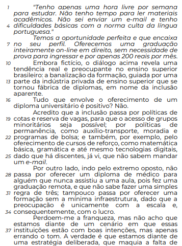 A respeito da pontuação empregada no trecho “dado que há discentes, já vi, que não sabem mandar um e-mail ” (linhas 25 e 26) e suas implicações sintáticas, assinale a alternativa correta.