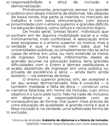 O vocábulo “que”, em “que a falsa inclusão” (linhas 68 e 69), retoma “A grande ironia” (linha 68).