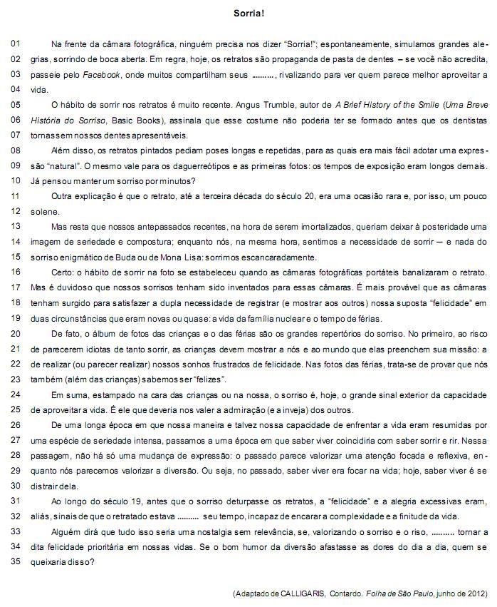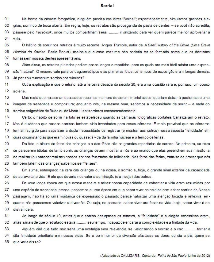 A desconfiança do autor em relação à autenticidade do sorriso e do estado atual de permanente alegria transparece no uso de aspas em várias expressões do texto. Leia os itens abaixo.