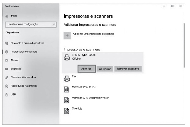 Usando o Microsoft Windows 10, em sua configuração padrão, um usuário enviou para a impressora um documento criado no Bloco de Notas, uma imagem do Paint e um documento do Wordpad. Enquanto o documento do Bloco de Notas ainda estava sendo impresso, esse usuário abriu a janela de Configuração do Painel de Controle e, dentro de Impressoras e scanners clicou no botão Abrir fila da impressora EPSON Stylus CX4700, conforme destaque na imagem a seguir.