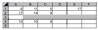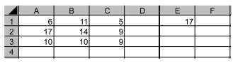 Considere que na célula E1 existe a função =MAIOR(A1:C3;1). Ao se selecionar a linha 3 por completo, clicar com o botão secundário do mouse sobre a numeração da linha e selecionar a opção Inserir, a planilha fica com o formato a seguir.