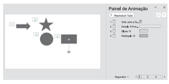 Um usuário criou 1 slide para uma apresentação no Microsoft PowerPoint 2016, em sua configuração padrão. Nesse slide, esse usuário adicionou 4 AutoFormas e configurou animações em cada uma delas, conforme imagem a seguir.