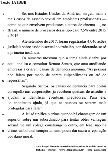 As opções a seguir apresentam propostas de reescrita do período “Se um colega constrange o outro, em tese, não há crime, embora tal comportamento possa dar causa a reparação por dano moral.” (ℓ. 21 a 23). Assinale a opção que apresenta proposta de reescrita que, além de manter o sentido original da informação, preserva a correção gramatical do texto.