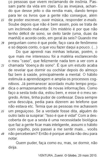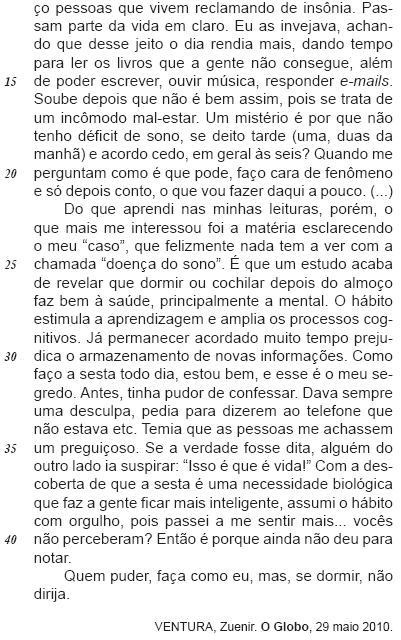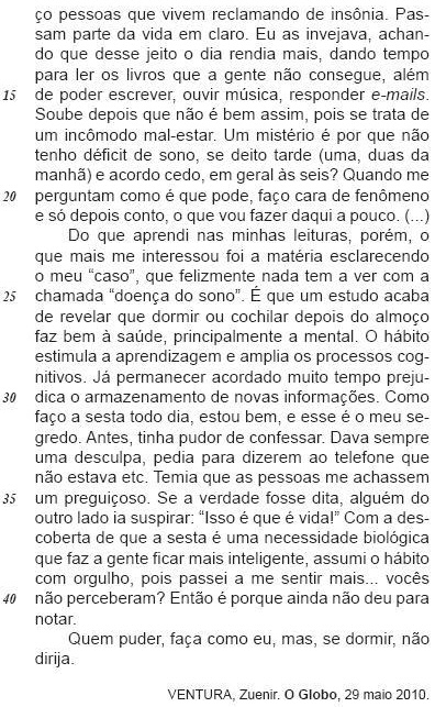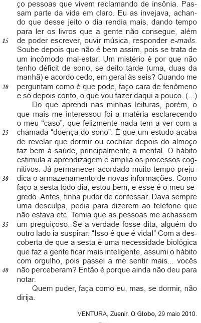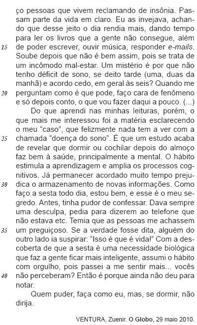III - "É que um estudo acaba de revelar que dormir ou cochilar depois do almoço faz bem à saúde, principalmente a mental." (L. 25-27)