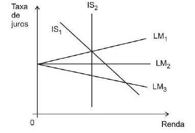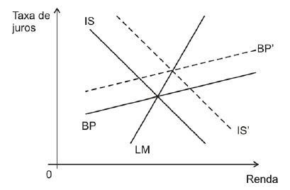 O gráfico abaixo representa o modelo IS/LM/BP aplicado a certo país. As posições iniciais das curvas IS, LM e BP são representadas pelas linhas cheias. As posições das linhas tracejadas, IS' e BP', mostram a reação de curto prazo da economia a uma variação da demanda agregada.