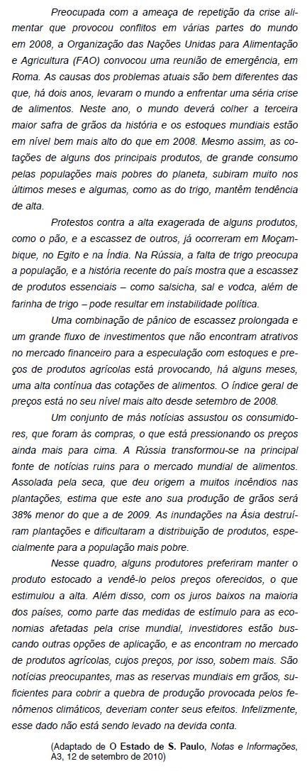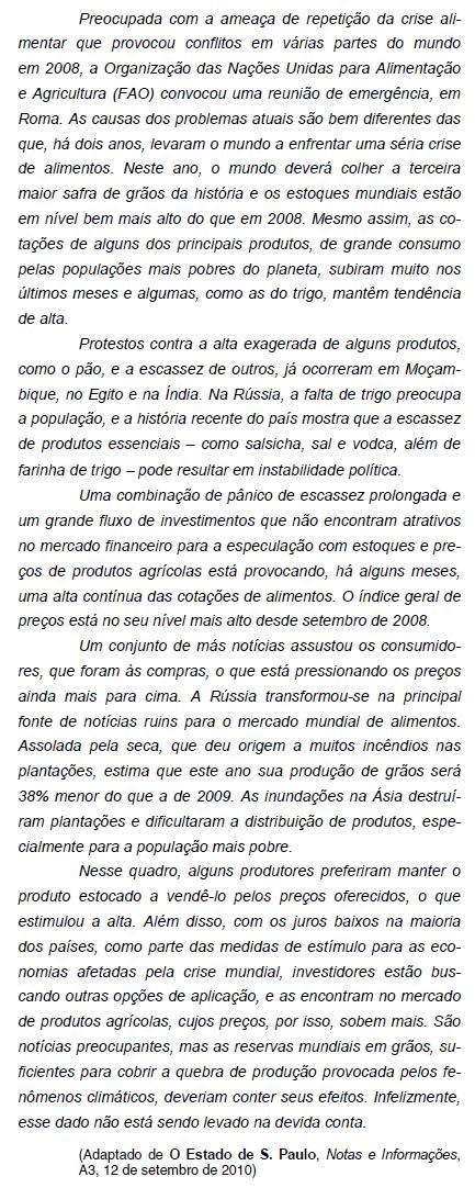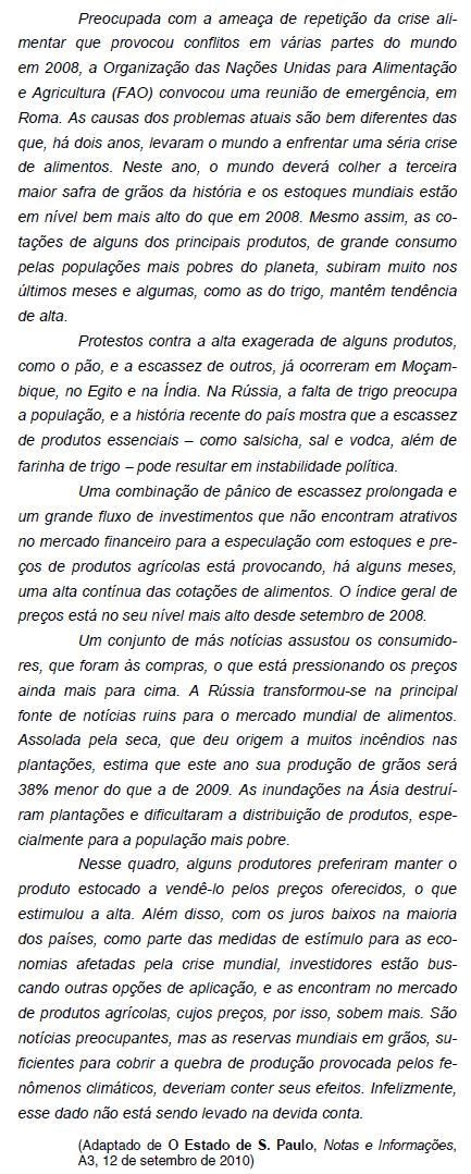 Preocupada com a ameaça de repetição da crise alimentar que provocou conflitos em várias partes do mundo em 2008, a Organização das Nações Unidas para Alimentação e Agricultura (FAO) convocou uma reunião de emergência, em Roma.