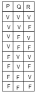 A partir dessas informações, infere-se que a última coluna da tabela-verdade, correspondente a (P ∧ Q) ∨ R, apresenta valores V ou F, de cima para baixo, na seguinte sequência