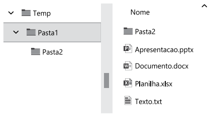 Tem-se a seguinte estrutura de pastas, apresentada pelo Explorador de Arquivos do Microsoft Windows 10, em sua configuração padrão, onde as pastas Temp e Pasta2 não contêm nenhum arquivo, e a pasta Pasta1 contém os arquivos apresentados a seguir.