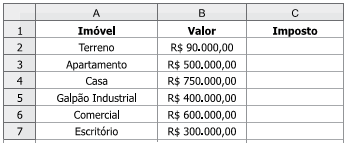 A fórmula para calcular imposto é dada a seguir. Essa fórmula foi inserida na célula C2 e copiada até a célula C7: