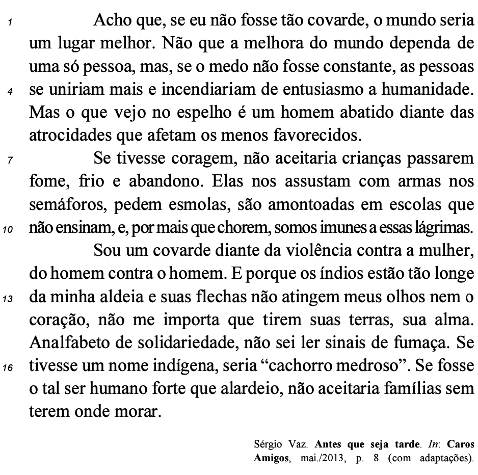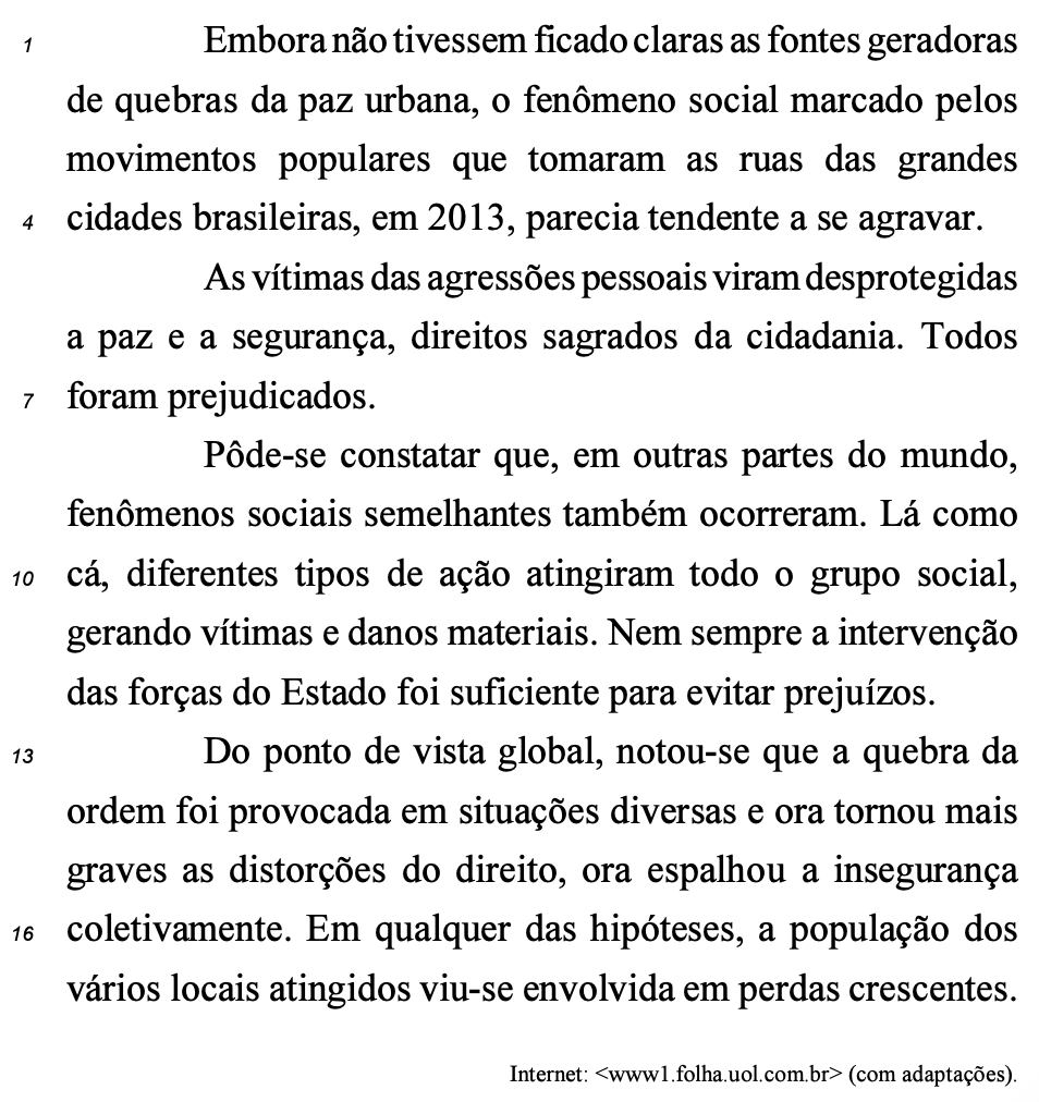 A correção gramatical bem como as informações originais do texto seriam mantidas caso o período “As vítimas das agressões pessoais viram desprotegidas a paz e a segurança, direitos sagrados da cidadania.” (l.5-6) fosse reescrito da seguinte forma: As pessoas agredidas viram-se desprotegidas em sua paz e segurança — prerrogativas legais consagradas da cidadania.