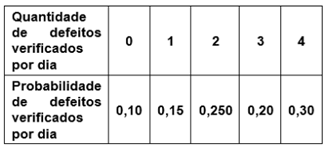 O departamento de manutenção de uma empresa de saneamento possui dados sobre o histórico de defeitos verificados em determinada peça do sistema de esgoto. Com base nas informações que possui, esse departamento formulou a seguinte distribuição de probabilidade da variável aleatória X, que representa a quantidade de peças que apresentaram defeitos por dia: