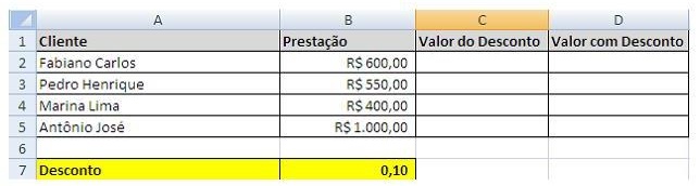 “Considerando que o valor de desconto é 10% sobre o valor da prestação, o usuário atribuiu à célula B7 tal valor de desconto. Na célula C2 deverá ser digitada a fórmula _______________ para calcular o valor do desconto do cliente ‘Fabiano Carlos’. Para replicar a fórmula do desconto (10%) aos demais clientes deve ser utilizada a _________________, que é representada por um pequeno quadrado preto na extremidade inferior direita da célula ativa. O valor com desconto do cliente ‘Pedro Henrique’ pode ser calculado na célula D3, inserindo a fórmula _______________.” Assinale a alternativa que completa correta e sequencialmente a afirmativa anterior.