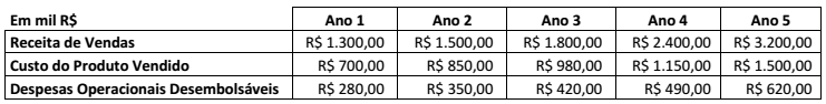 Admita que uma empresa esteja avaliando uma proposta de investimento visando a expansão de sua atividade. Os principais dados levantados para o projeto de investimento foram: