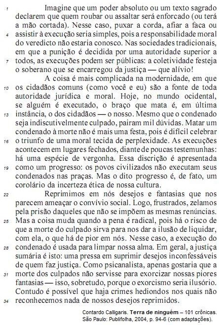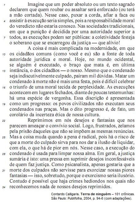 Suprimindo-se o emprego de termos característicos da linguagem informal, como o da palavra “coisa” (l.9) e o do trecho “(como você e eu)” (l.10), o primeiro período do segundo parágrafo poderia ser reescrito, com correção gramatical, da seguinte forma: Essa prática social apresenta-se mais complexa na modernidade, onde a autoridade jurídica e moral submete-se à opinião pública.