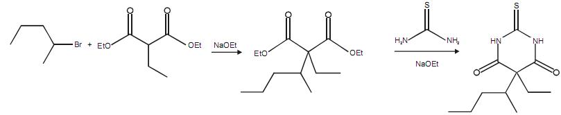 Considerando-se a reação ilustrada abaixo, correspondente à síntese do tiopental, em que “Et” refere-se ao grupo etil, é correto concluir que a síntese dessa molécula se inicia com uma alquilação em uma molécula pertencente ao grupo éster.