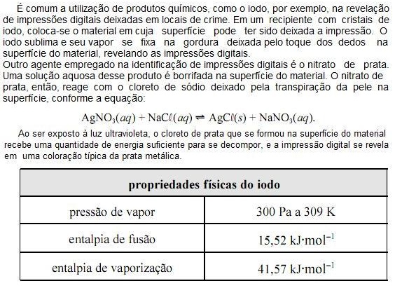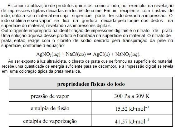 Com base nas informações do texto e da tabela apresentada acima e considerando que a constante universal dos gases ideais (R) seja igual a 8,0 J•K–1 •mol–1 e que o vapor de iodo obedeça à lei dos gases ideais, julgue os próximos itens.