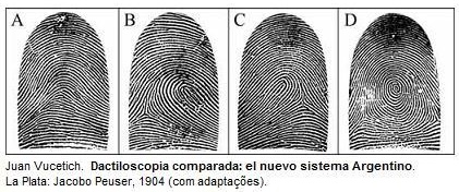 A partir das ilustrações de impressões digitais acima, identificadas pelas letras de A a D, julgue os itens seguintes com base no sistema datiloscópico de Vucetich.