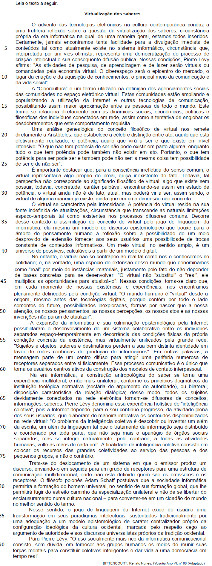 - “Nessas condições, Pierre Lévy afirma : ´As atividades de pesquisa, de aprendizagem e de lazer serão virtuais ou comandadas pela economia virtual´ . “ (linhas 7- 9)