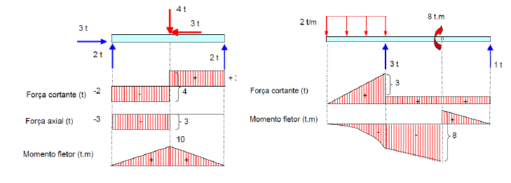 A partir dos diagramas de força axial, força cortante e momento fletor apresentados para os carregamentos a seguir, é possível afirmar: