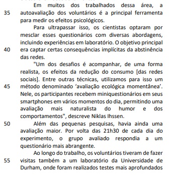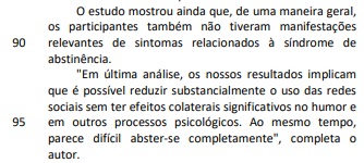 Em relação às ideias do texto, analise as afirmativas a seguir: I. A abstinência em relação às redes sociais provoca um duplo efeito: ao mesmo tempo em que protege o indivíduo de sentimentos negativos, pode levá-lo a sofrer pela ausência de recompensas positivas. II. Um dos motivos para a não adesão à pesquisa foi a justificativa de não ficar longe das redes sociais, e isso prejudicou largamente os resultados obtidos, pela falta de representatividade. III. A permanência dos aplicativos nos celulares possibilitou o monitoramento de recaídas dos participantes, ao mesmo tempo em que não tornava necessário buscar outros aparelhos caso não resistissem ao experimento.