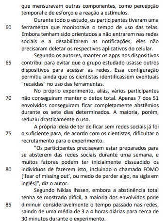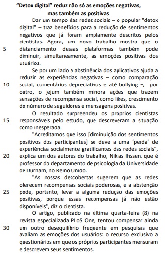 Dar um tempo das redes sociais – o popular "detox digital" – traz benefícios para a redução de sentimentos negativos que já foram amplamente descritos pelos cientistas . (L.1-4) O nome popular para “dar um tempo das redes sociais” constitui, como no período acima, exemplo de