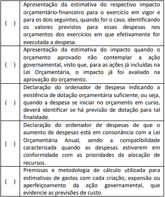 A Lei Complementar 101 de 04 de maio de 2000 – Lei de Responsabilidade Fiscal (LRF), em seus artigos 15 e 16 apresenta as regras para criação, expansão e aperfeiçoamento da ação governamental que acarrete aumento de despesa, sendo que estas só podem ser instituídas se forem apresentados os requisitos determinados na referida legislação. A respeito deles, julgue as afirmativas a seguir em verdadeiras (V) ou falsas (F).
