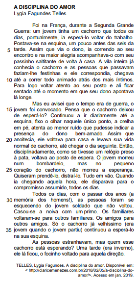 o discurso direto, predominantemente, como é possível verificar na passagem: “As pessoas estranhavam, mas quem esse cachorro está esperando?” (linhas 37-38)