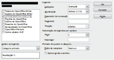 A figura a seguir foi extraída do Apache OpenOffice Writer 4.0.1 em sua configuração padrão. Ela apresenta as opções do botão Autolegenda..., da caixa de diálogo que pode ser acessada a partir do item Legenda... do menu de contexto de uma figura.
