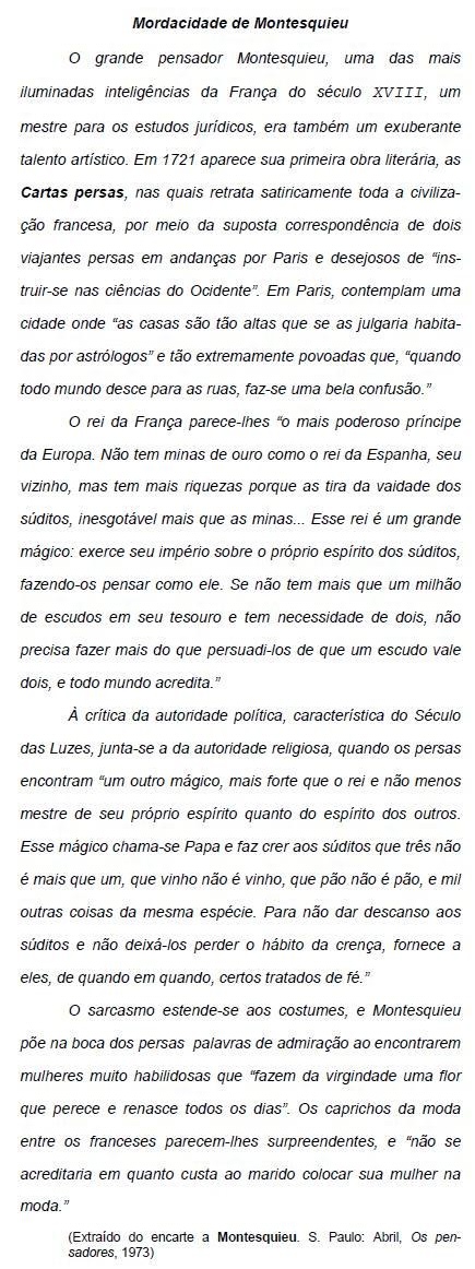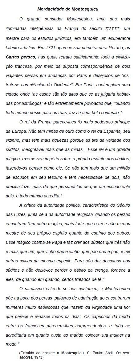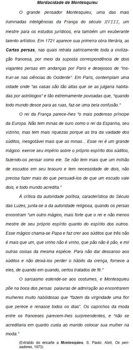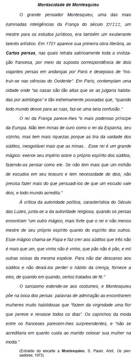 II. Na frase O sarcasmo estende-se aos costumes, e Montesquieu põe na boca dos persas palavras de admiração ao encontrarem mulheres muito habilidosas (...), a conjunção e pode ser substituída por haja vista que.