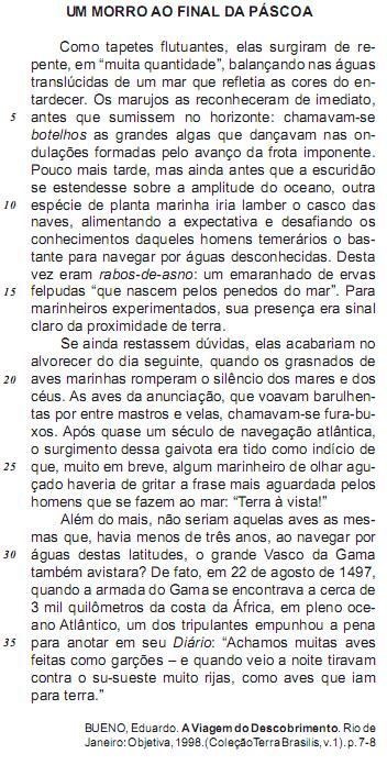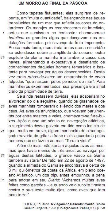 No Texto II, a palavra (ou expressão) que completa sintaticamente o verbo avistara no período “Além do mais, não seriam aquelas aves as mesmas que havia menos de três anos ao navegar por águas destas latitudes o grande Vasco da Gama também avistara?” (L. 28-31) é