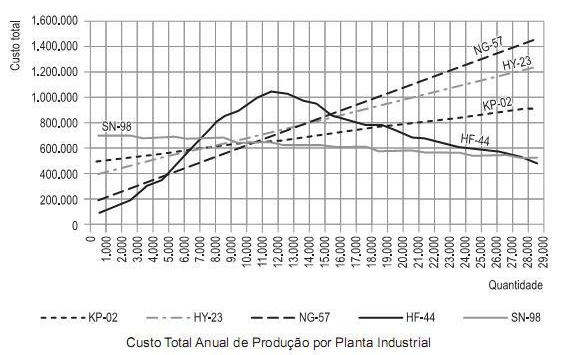 O diretor de operações de uma empresa industrial está estudando a expansão da capacidade produtiva. A planta em estudo atenderá exclusivamente às necessidades de produção de um novo produto. Foram analisadas 5 plantas industriais que podem ser adquiridas para abrigar a nova produção. Após apurar todos os custos envolvidos, chegou-se à equação de Custo Total anual de produção (em milhares de reais) de cada planta industrial, em função da quantidade anual produzida, conforme o gráfico abaixo. Cada planta industrial é representada por letras e números. Todas as plantas em estudo atendem igualmente aos critérios técnicos e de qualidade exigidos.