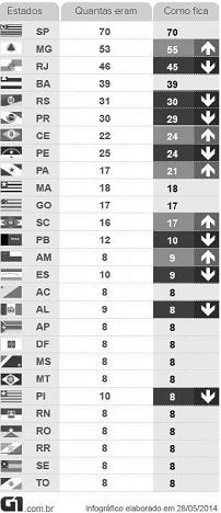 A figura representa a distribuição das bancadas por unidade federada na Câmara dos Deputados antes e após os ministros do TSE decidirem, por unanimidade, ratificar Resolução de 2013 da própria Corte que havia alterado o tamanho das bancadas na Câmara dos Deputados. Leia a figura atentamente.