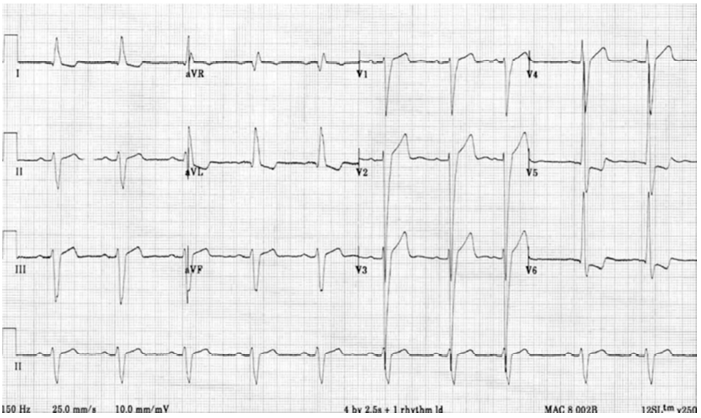 Uma paciente de 44 anos de idade foi atendida em consulta ambulatorial. Relatou diagnóstico de síndrome do túnel do carpo, hipertensão arterial sistêmica (HAS) e diabetes do tipo 2 (DM2) havia cinco anos, em uso regular de anlodipino, enalapril, hidroclorotiazida, metformina e vildagliptina nas doses máximas preconizadas. Ela mencionou lombalgia e hiperidrose. Ao exame físico, apresentava hiperlordose lombar, prognatismo mandibular, circunferência abdominal de 98 cm, pressão arterial de 154 mmHg × 98 mmHg (média de três medidas) e frequência cardíaca de 60 bpm, além de dor e limitação articular na região lombar. Os demais achados do exame físico mostraram-se normais. Foram pedidos alguns exames laboratoriais de rotina cujos resultados revelaram: triglicerídeos de 198 mg/dl, colesterol total de 240 mg/dl; HDL colesterol de 30 mg/dl, LDL colesterol de 170 mg/dl, glicemia de jejum de 150 mg/dl e hemoglobina glicada de 8%. Os demais exames não revelaram anormalidades significativas e o eletrocardiograma obtido é apresentado a seguir.