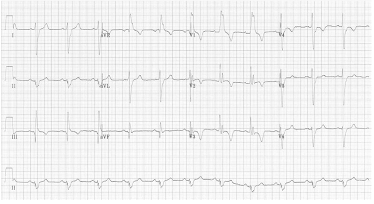 Uma paciente de 78 anos de idade relatou, durante atendimento ambulatorial, intensa dor torácica à direita, com piora à inspiração profunda, acompanhada de dispneia súbita e um episódio de síncope havia seis horas. Reportou que havia retornado de uma viagem de carro de doze horas havia três dias. Ao exame físico encontrava-se dispneica, com frequência cardíaca de 128 bpm, frequência respiratória de 32 respirações por minuto, saturação de oxigênio de 86% e pressão arterial de 84 mmHg × 56 mmHg. Não foram detectadas outras alterações significativas ao exame. Os marcadores de necrose cardíaca, exames laboratoriais de rotina e raio X de tórax solicitados mostraram-se normais. O eletrocardiograma, com calibração padrão, dessa paciente é apresentado a seguir.