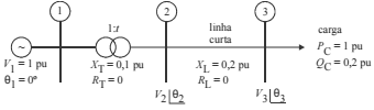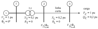 A figura acima ilustra o diagrama unifilar representando um sistema elétrico de potência que opera em regime permanente.Os dados das grandezas envolvidas e dos parâmetros de determinada base de potência e de tensão são informados em pu. Os parâmetros do transformador são sua resistência R T, reatância X T e tap t . Os dados da linha referem-se aos componentes de sua impedância série (resistência R L e reatância indutiva X L). A carga absorve tanto potência ativa, igual a 1,0 pu, quanto potência reativa, igual a 0,2 pu. Resolveu-se o problema de fluxo de carga, sendo obtidas as magnitudes de tensão genéricas V 2 e V 3 e as fases θ2 e θ3 nas barras 2 e 3, respectivamente.